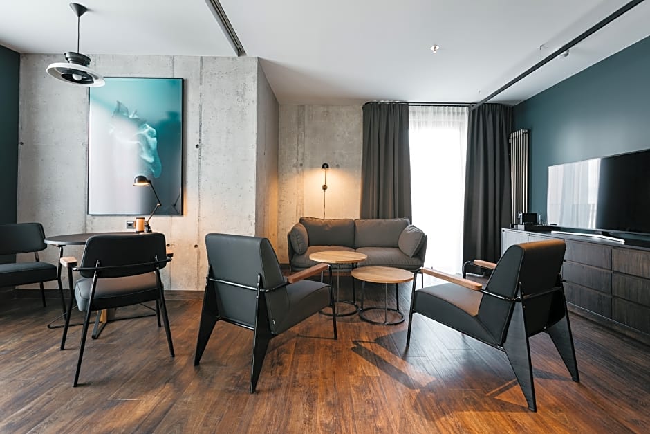 Featuring a view of the courtyard garden, this suite has a seating area, flat-screen TV.